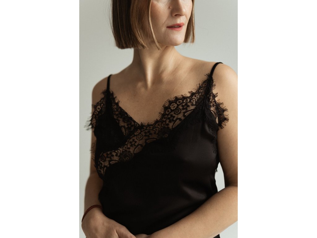 Jemné šaty zo saténu s elegantným výstrihom do V, ktoré pôsobia nežne a zmyselne zároveň. Vyrobené zo zmesi viskózy, príjemnej na dotyk a s ľahkým leskom. Tenké nastaviteľné ramienka umožňujú dokonalé prispôsobenie postave.