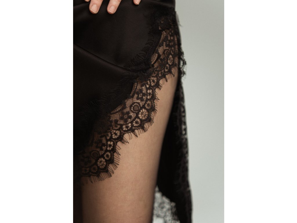 Šaty zdobia jemné čipkové aplikácie. Asymetricky zrezaný lem na boku prináša prirodzený pohyb a ženskosť, ktorá sa odhaľuje s každým krokom.