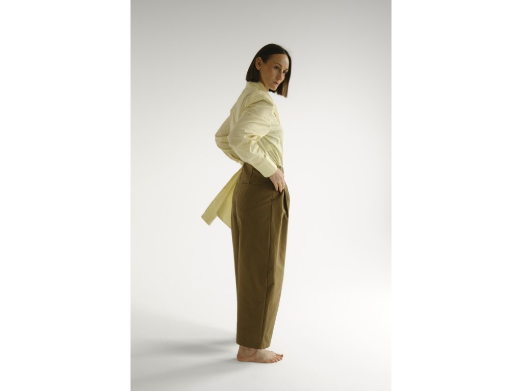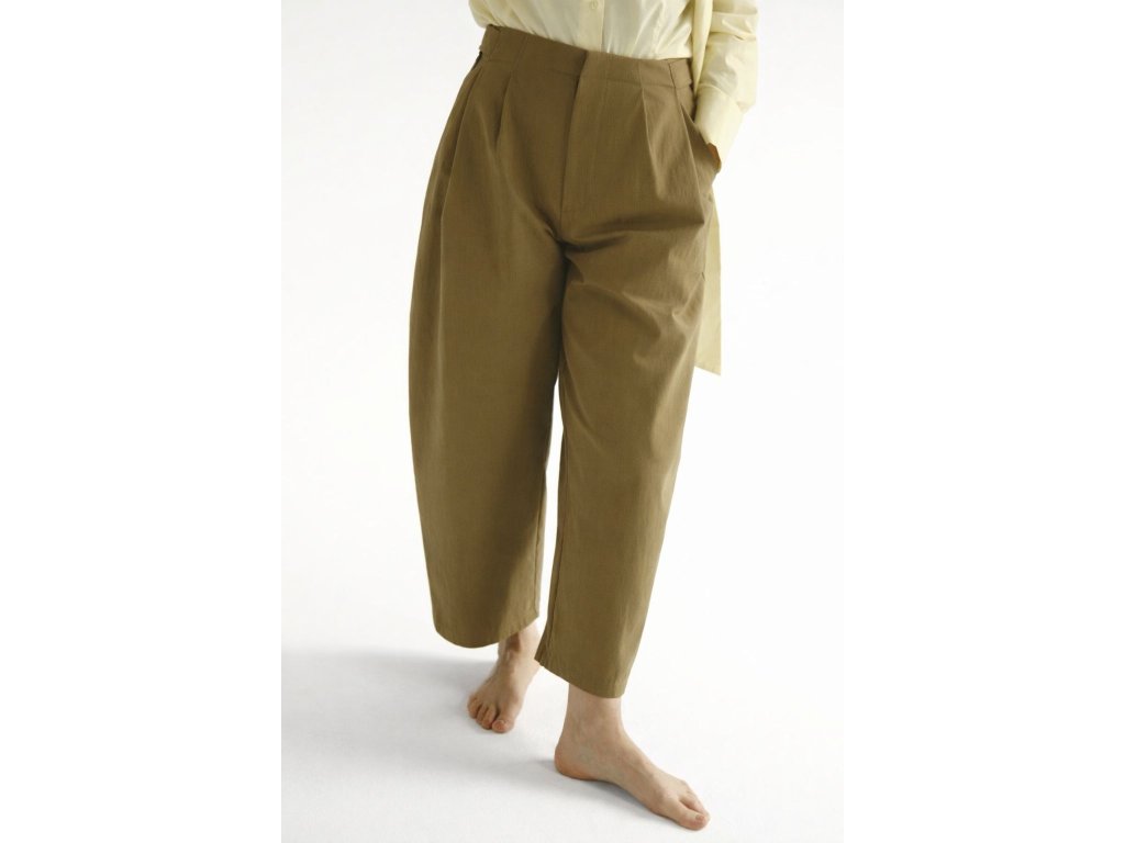 Moderné barrel nohavice z bavlnenej zmesi s vysokým pásom, ktorý krásne tvaruje siluetu. Predný skladaný detail (pleats) dodáva nohaviciam sofistikovaný vzhľad a zároveň podporuje pohodlie pri nosení. Zadné vrecká sú funkčným aj dizajnovým prvkom. Zapínanie vpredu na zips s nenápadným háčikom zabezpečuje čistú a elegantnú líniu. Ideálny kúsok na každodenné nosenie aj štýlové mestské outfity.