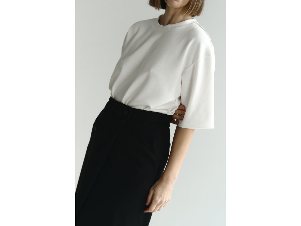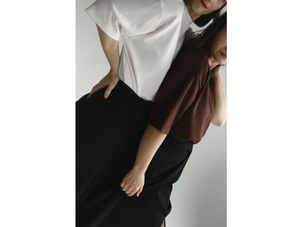 Materiál s vysokým podielom bavlny je príjemný, jemne hrubší a zároveň padavý, vďaka čomu pôsobí kvalitne, drží tvar a vytvára elegantné línie.