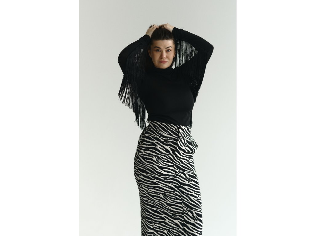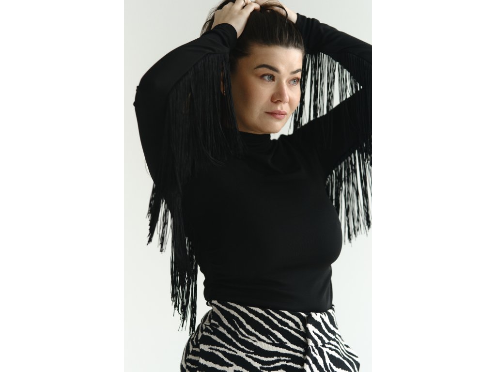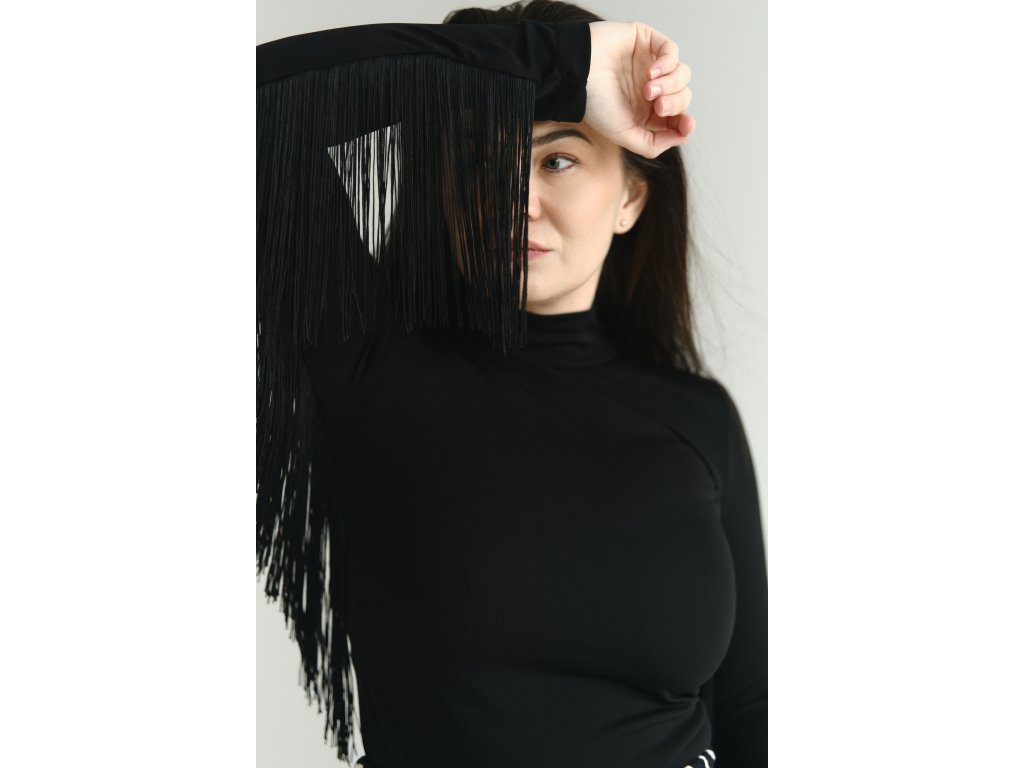 Výnimočný kúsok, ktorý okamžite pritiahne pozornosť. Toto čierne body s vysokým golierom kombinuje čistú eleganciu s moderným, výrazným prvkom – dlhými strapcami po bočných líniách rukávov, ktoré pri pohybe pôsobivo vlnia a dodávajú outfitu dynamiku aj štipku odvážnosti.