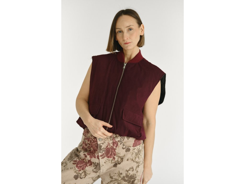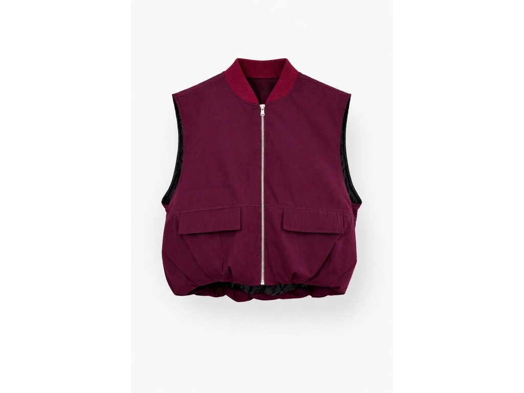 Charakteristický okrúhly výstrih a výrazné zapínanie na kontrastný zips dodávajú veste čistý, súčasný vzhľad. Spodná časť je ukončená gumičkou, ktorá vytvára typickú bomber siluetu a krásne drží tvar. Praktické dve vonkajšie vrecká s klopami podčiarkujú funkčný, no zároveň elegantný charakter modelu.