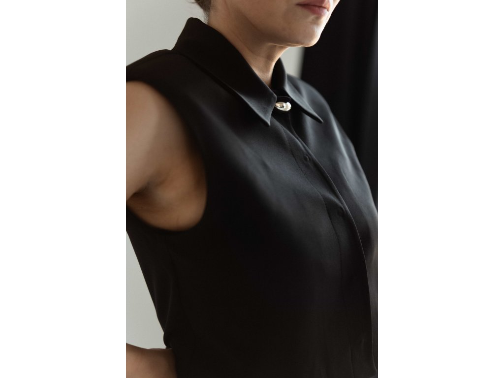 Čierna vesta s výrazným golierom a zapínaním na diskrétne cvoky až ku krku. Skrátený strih a uvoľnené línie vytvárajú moderný kontrast medzi eleganciou a nenútenosťou.
