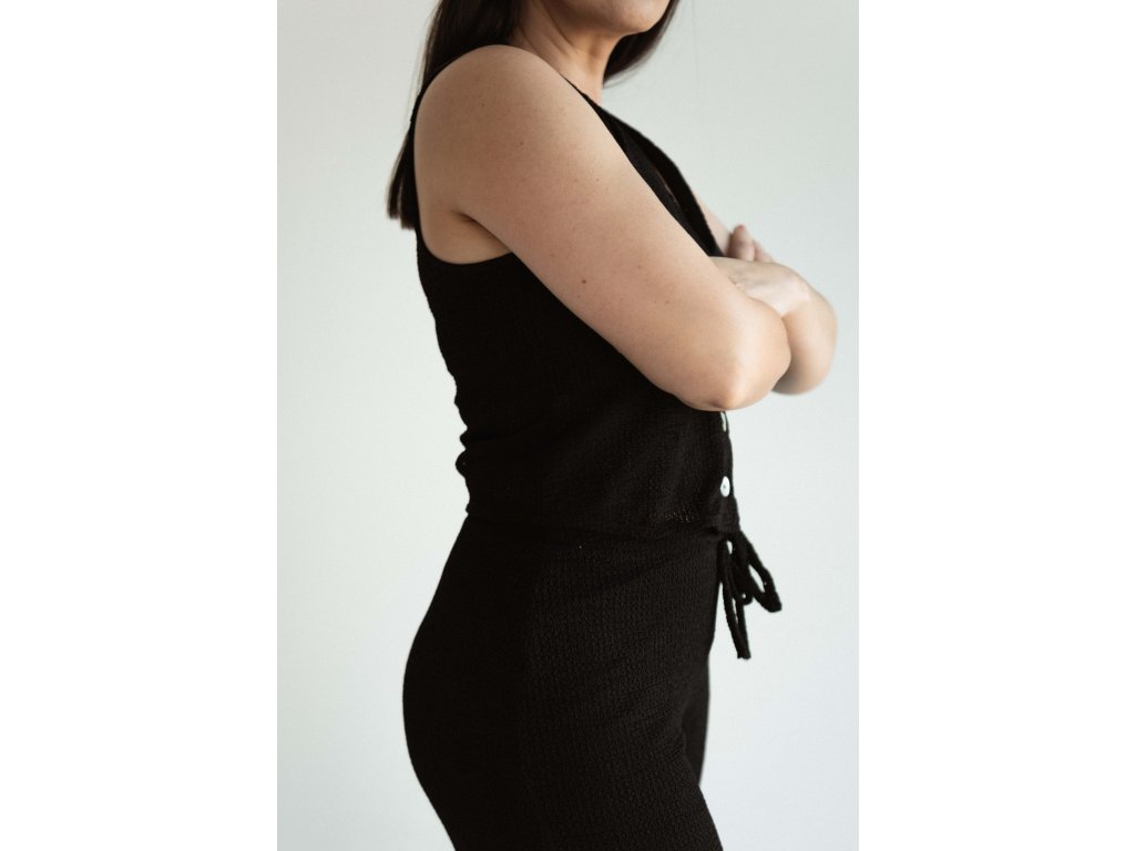 Vzdušný dvojdielny set, ktorý spája pohodlie s nenúteným štýlom pozostáva z topu s krátkym rukávom a gombíkmi, doplneného o dlhé nohavice s rovným, voľným strihom. Jemne dierkovaný, priedušný materiál zaručuje komfort ľahkosť aj počas horúcich dní.