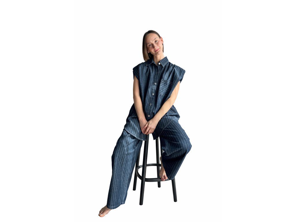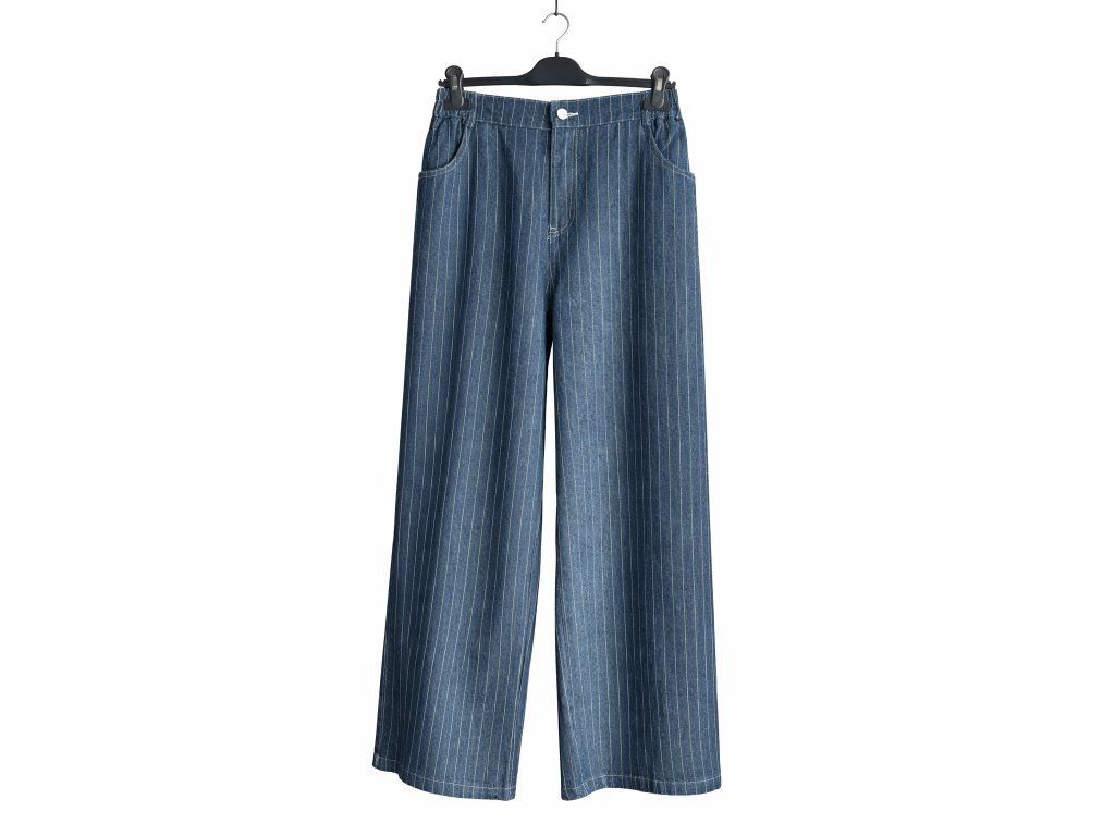 Ľahký denim, ktorý drží tvar a zároveň pôsobí uvoľnene a pinstripe prúžok po celej dĺžke opticky predlžuje postavu.