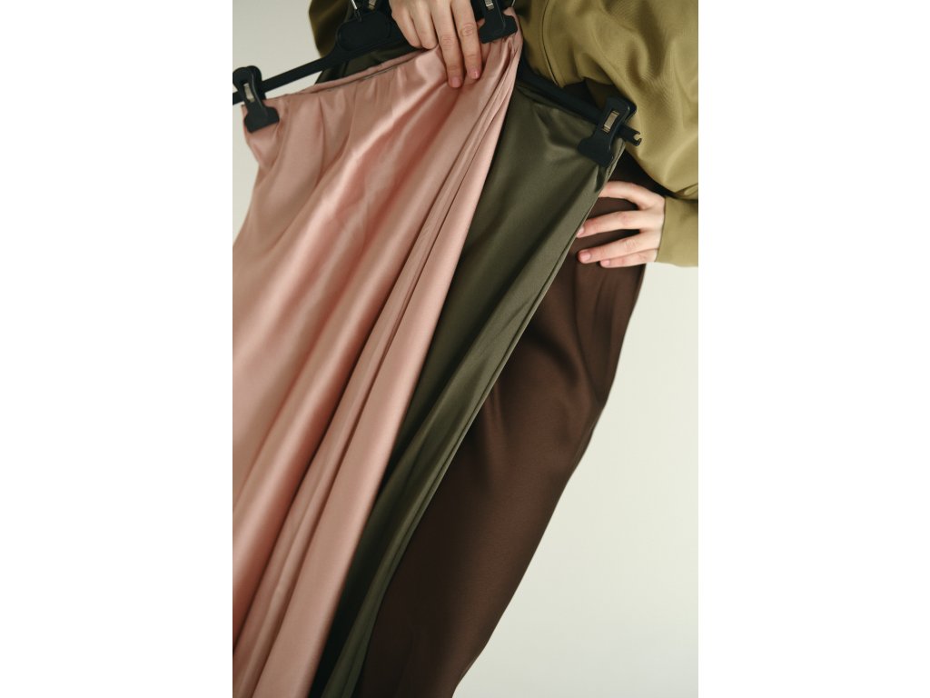 Ľahká a splývavá saténová sukňa s uvoľneným, elegantným charakterom. Model s vysokým pásom a elastickým opaskom pre maximálne pohodlie. Áčkový strih s mierne rozšíreným spodným lemom vytvára prirodzený pohyb a lichotivú siluetu.