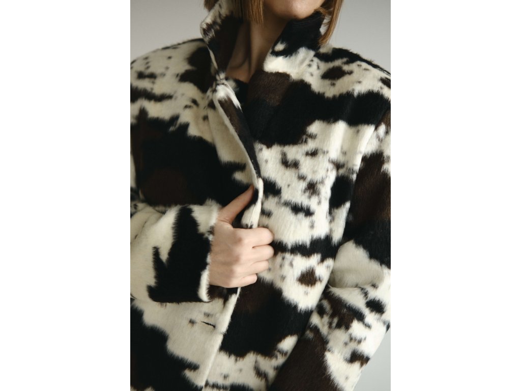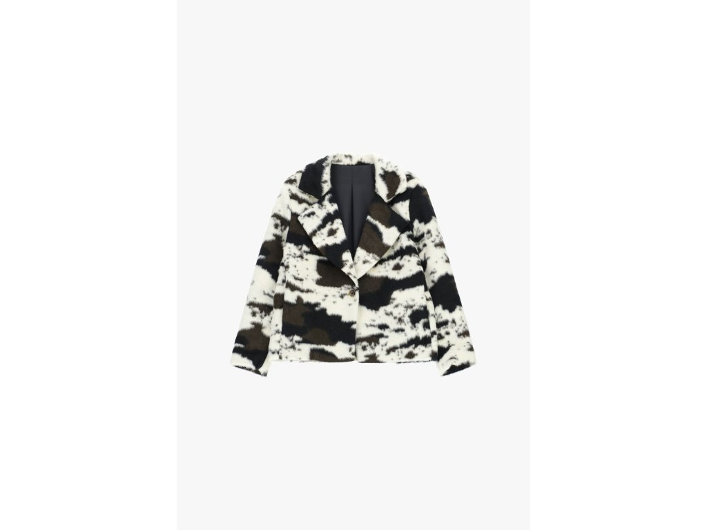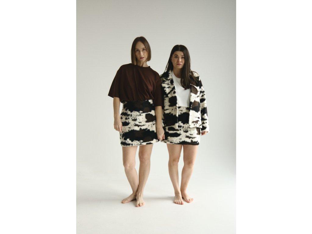 Výrazné, moderné sako, ktoré okamžite pritiahne pozornosť svojim ikonickým faux-fur vzorom. Je ideálne na jesenné a zimné stylingy, a dokonale ladí s rovnakou minisukňou z kolekcie.