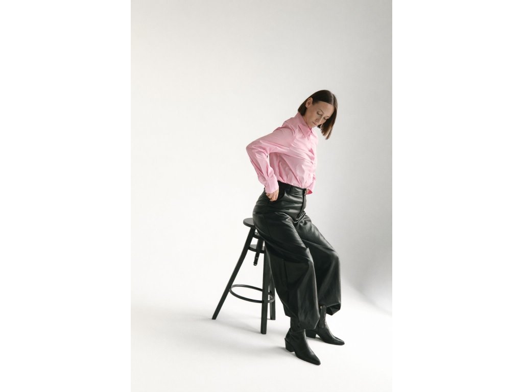 Čierne koženkové nohavice s modernou širšou siluetou, ktorá pôsobí výrazne, no zároveň nadčasovo a stále žensky. Mäkký materiál, zároveň padavý je príjemný na nosenie a dodáva outfitu elegantný, sofistikovaný charakter.