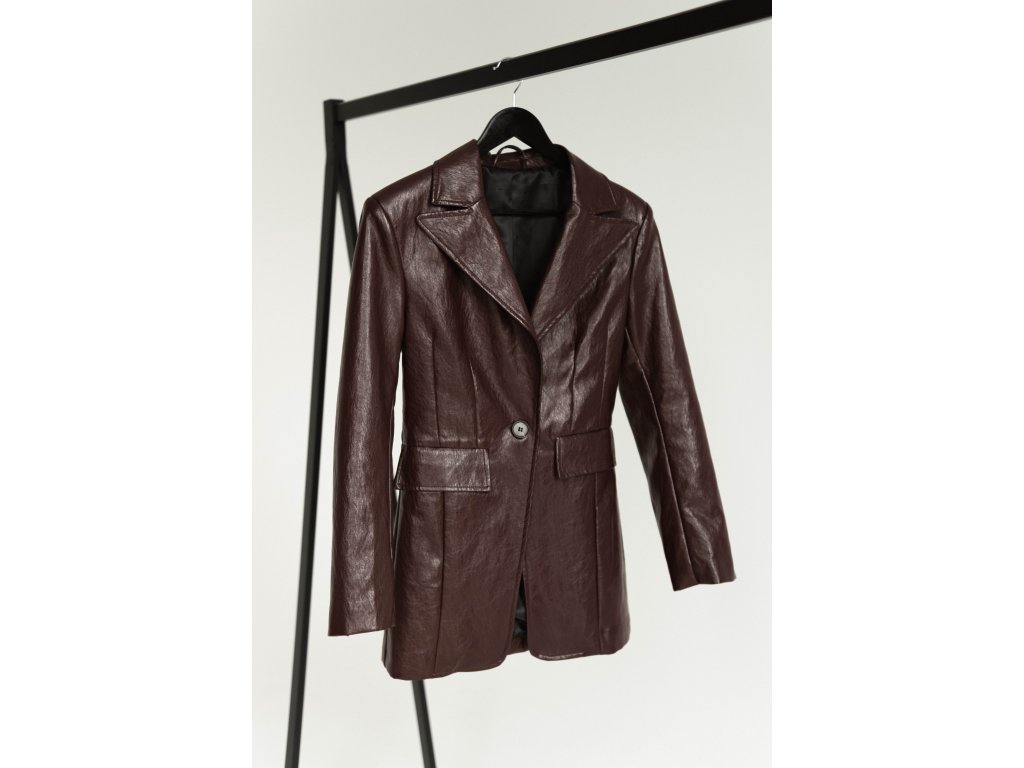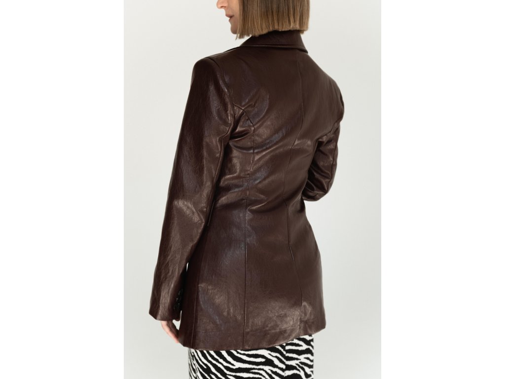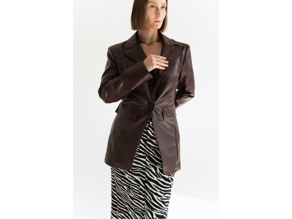 Tento blazer je navrhnutý s fazónovým golierom a vystuženými ramenami, vďaka čomu pôsobí sebavedomo a štruktúrovane. Lesklý efekt eco kože prináša moderný nádych a subtílnu hru svetla a tieňa.