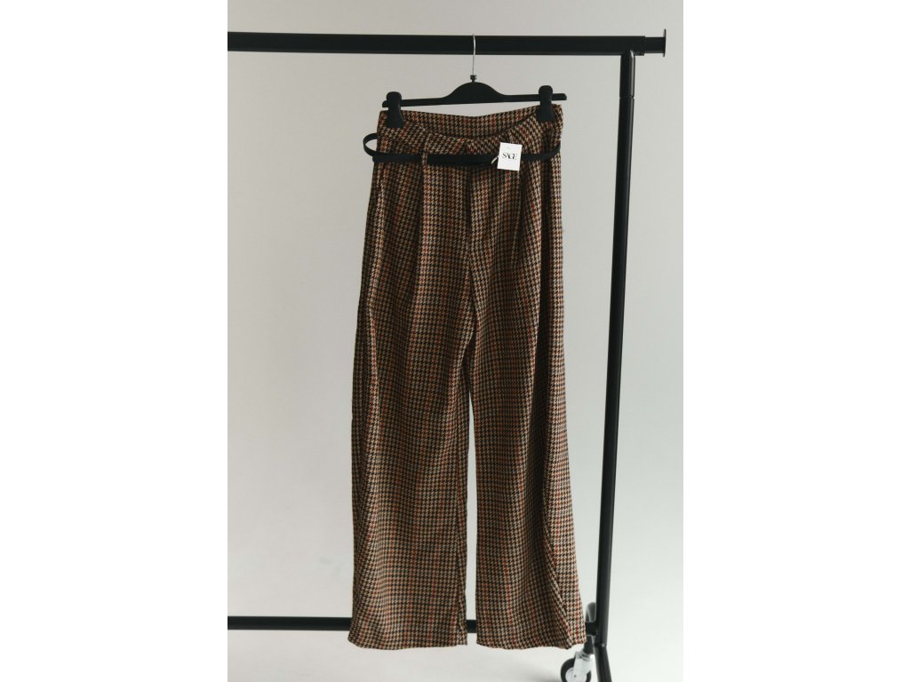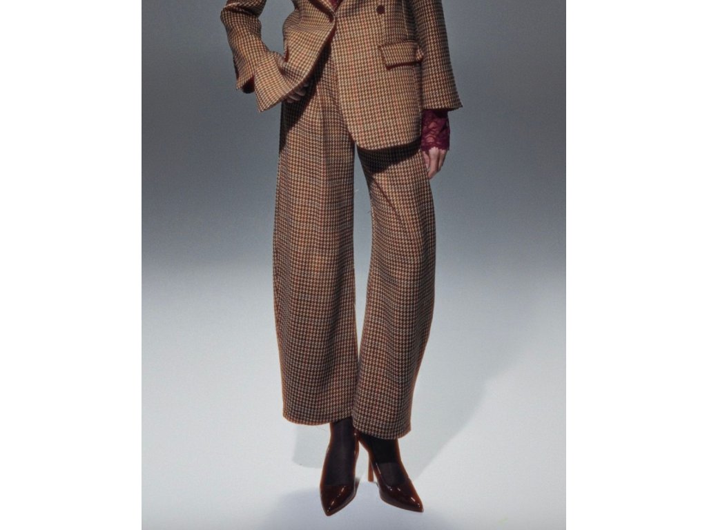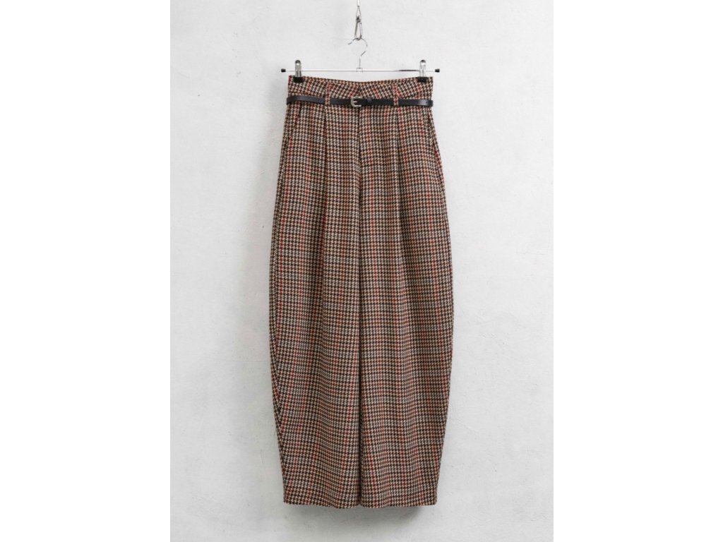 Elegantné nohavice z kvalitnej zmesi vlny s nadčasovým vzorom. Strih s vysokým pásom zvýrazňuje siluetu a dopĺňa ho opasok. Nohavice majú voľnejší rovný strih s jemným záhybom vpredu, ktorý dodáva pohyb a štruktúru.