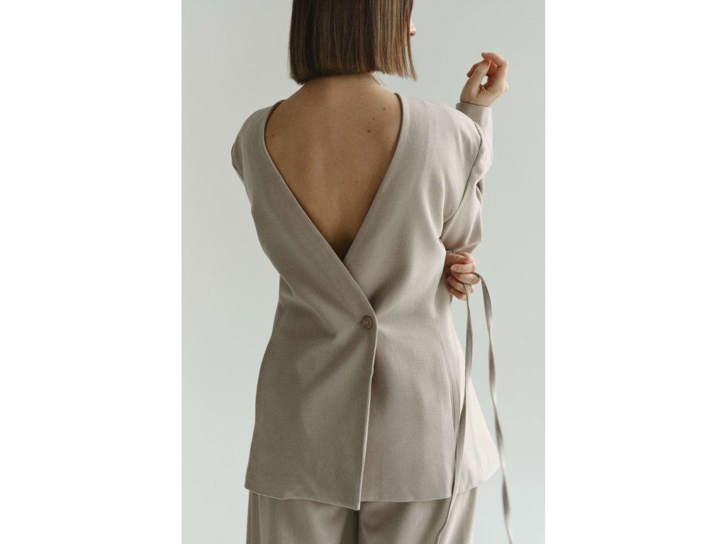 Sako na jeden gombík je tvarované tak, aby prirodzene zvýraznilo pás a vytvorilo siluetu presýpacích hodín. Prekladaný strih s výstrihom do V opticky predlžuje postavu a dodáva modelu ženskú eleganciu. Vďaka opasku z rovnakého materiálu je možné siluetu prispôsobiť podľa potreby – nosiť ju uvoľnene alebo zvýrazniť pás.