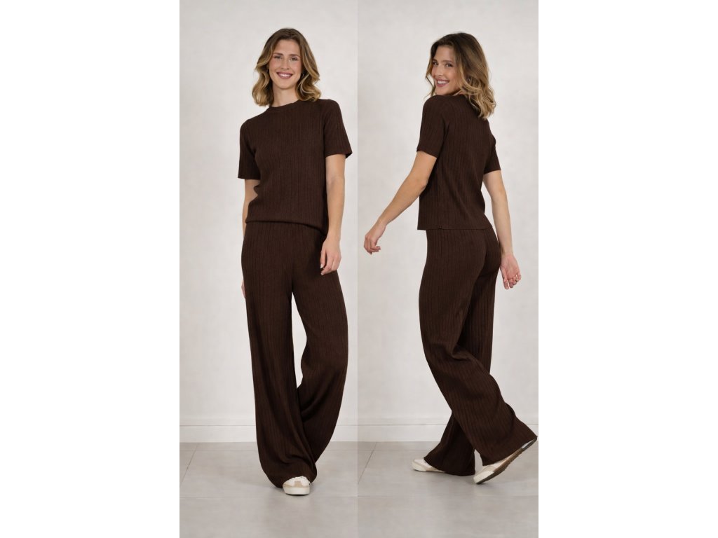 Mäkký pletený set v čokoládovo hnedej farbe, vyrobený z príjemnej zmesi viskózy, polyesteru a polyamidu.