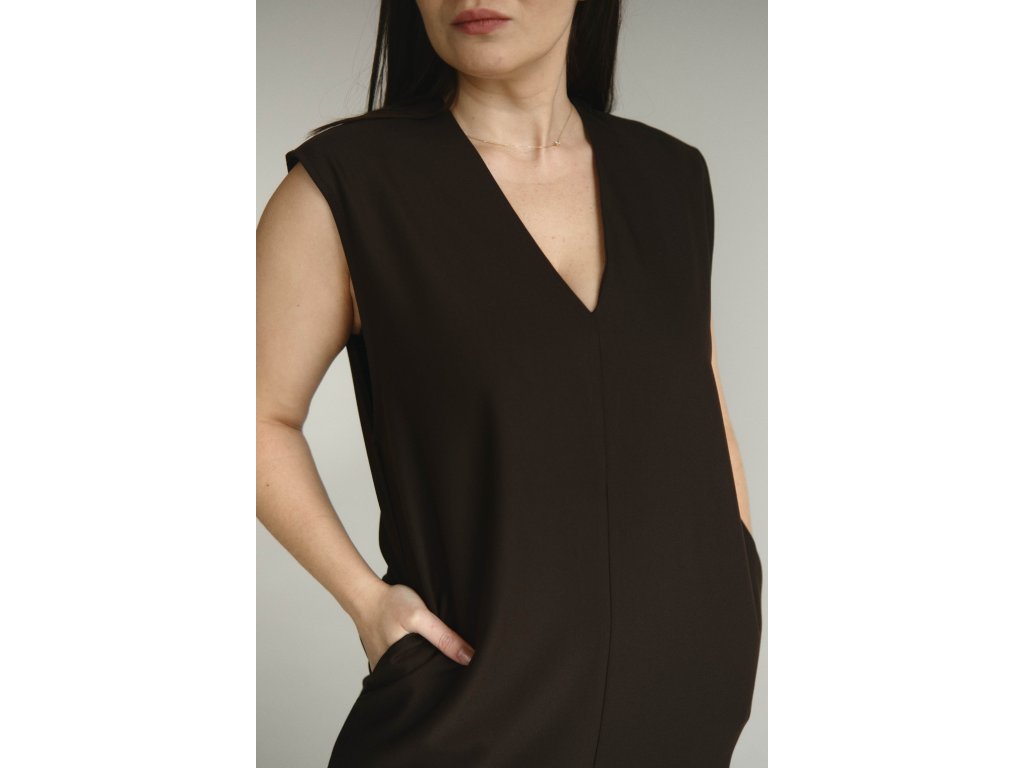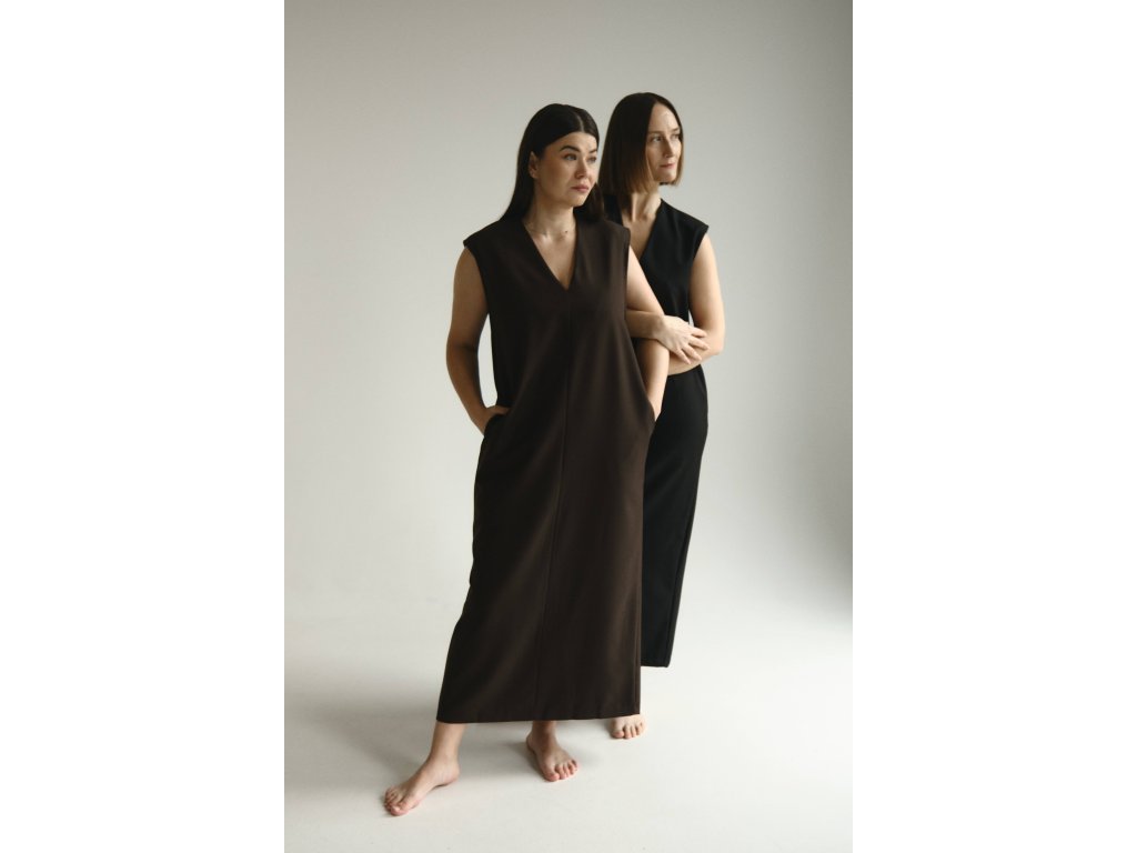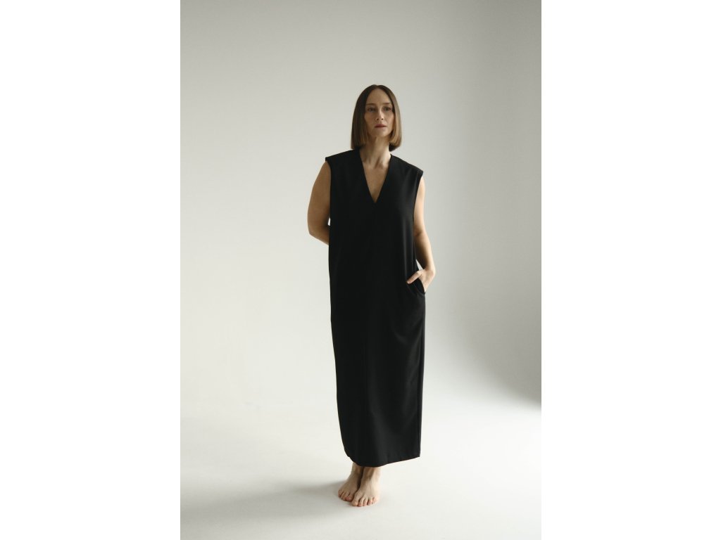 Dlhšie trojštvrťové šaty, ktoré spájajú eleganciu a pohodlie. Ušité z kostýmového pevného materiálu, ktorý zároveň krásne padá a zachováva sofistikovaný strih.
