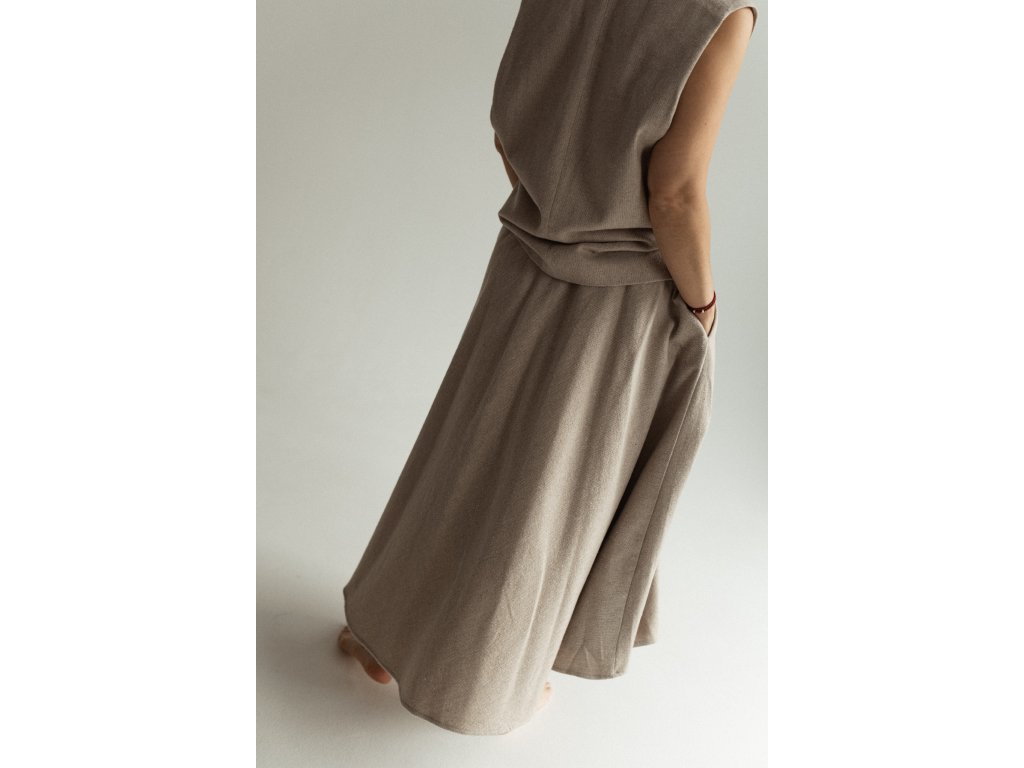 Sukňa v midi dĺžke má jemne kruhový strih, ktorý voľne padá a pri chôdzi pôsobí žensky a ľahko.