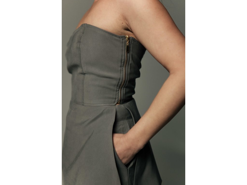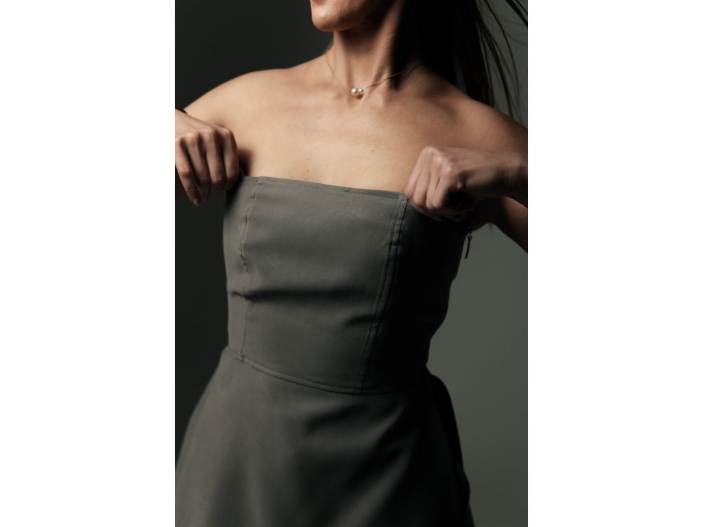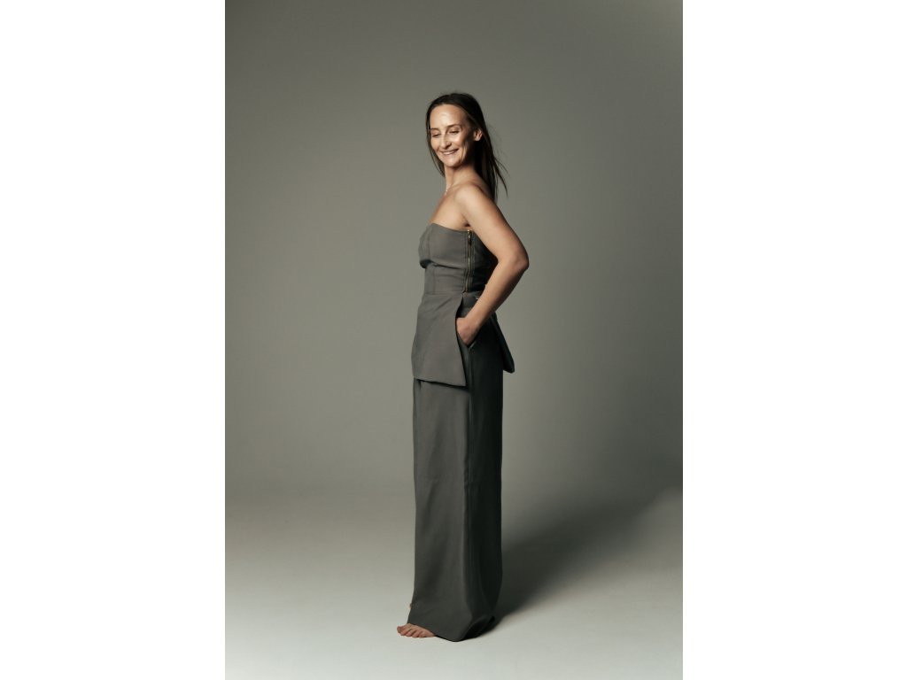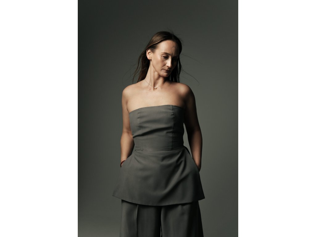 Dlhší top s odhalenými ramenami spája ženskosť, čisté línie a komfort v jednej harmonickej siluete. Spevneným strihom jemne kopíruje líniu tela a svojím prevedením pripomína korzetový štýl — bez zbytočnej zdobnosti, no s maximálnym efektom. V kombinácii so širokými nohavicami rovného strihu s vyšším pásom a diskrétnymi vreckami pôsobí celý outfit premyslene a žensky.