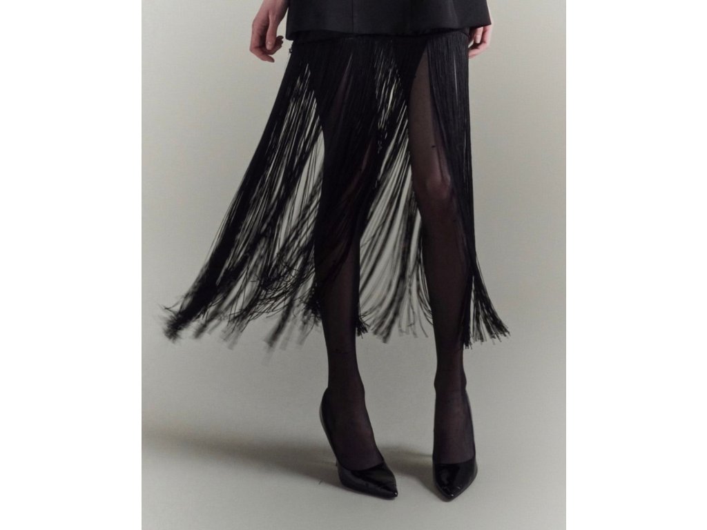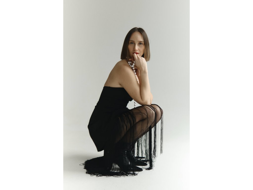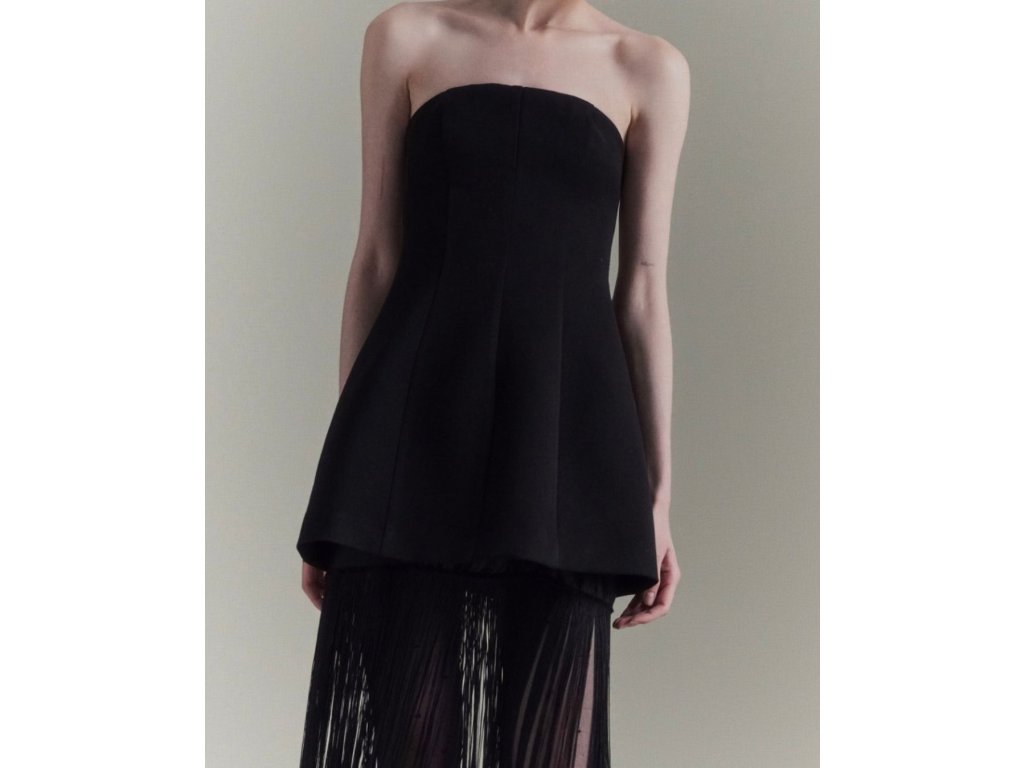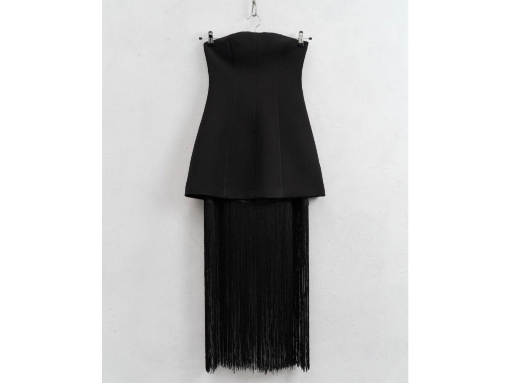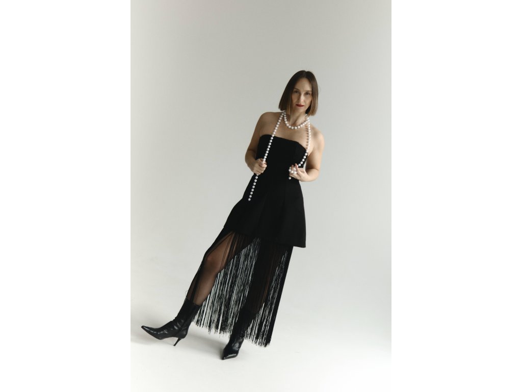 Elegantné čierne šaty s bandeau výstrihom a výrazným strapcovým detailom, ktorý sa pri pohybe jemne vlní a dodáva modelu pôvab aj dynamiku. Ich prepracovaný asymetrický strih opticky predlžuje siluetu a vytvára sofistikovaný večerný look.