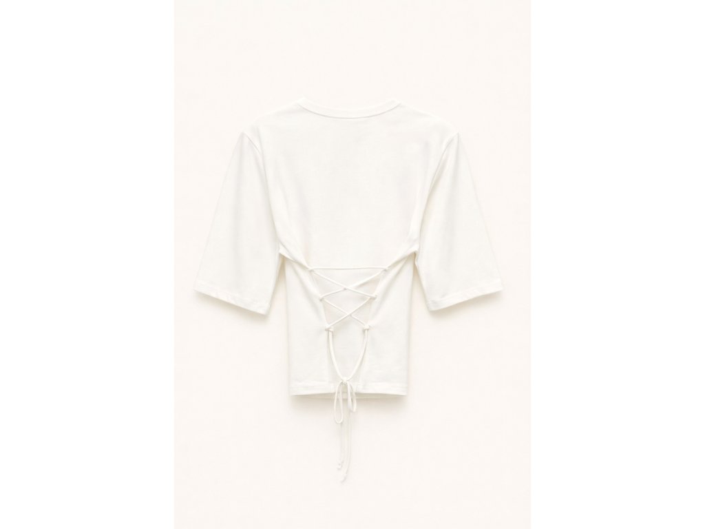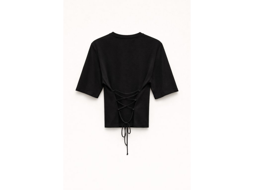 Dominantným prvkom je nastaviteľné prekladané zapínanie na chrbte, vďaka ktorému si môžeš prispôsobiť strih podľa seba – viac priliehavý alebo uvoľnenejší.