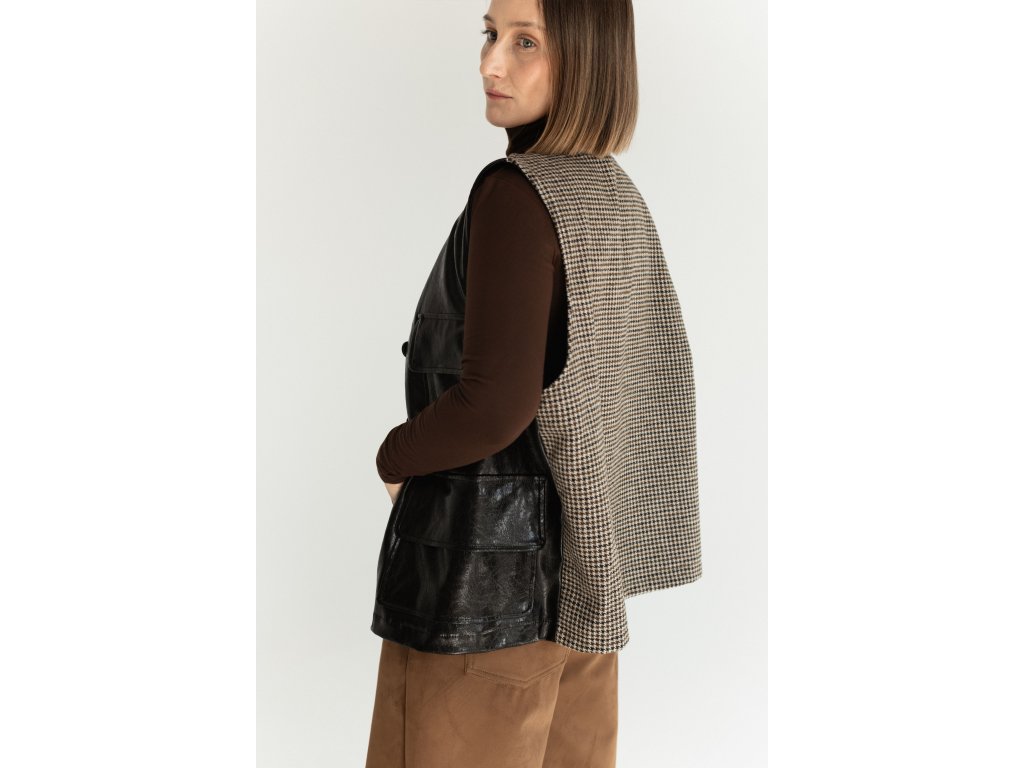 Zadná časť je z odlišného materiálu s pepito vzorom, klasickým a neumirajúcim motívom, ktorý dodáva veste štruktúru, štýl a unikátny kontrast.