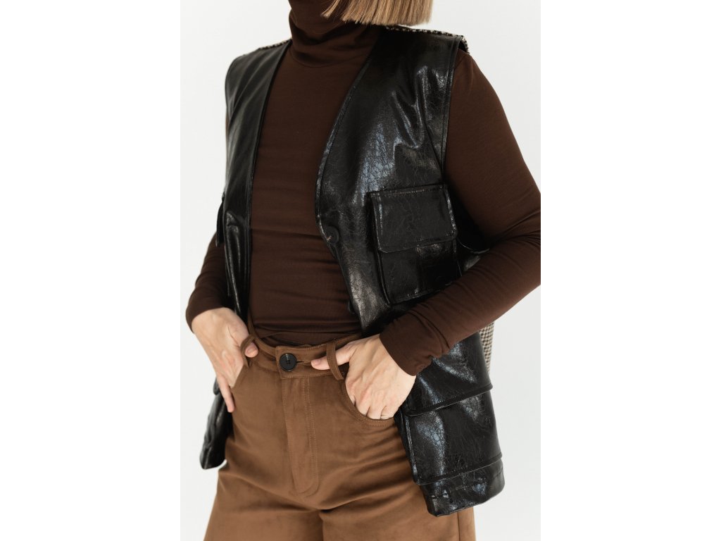 Predná časť z ECO kože, výrazné technické vrecká a zapínanie na gombíky dodávajú veste moderný charakter.
