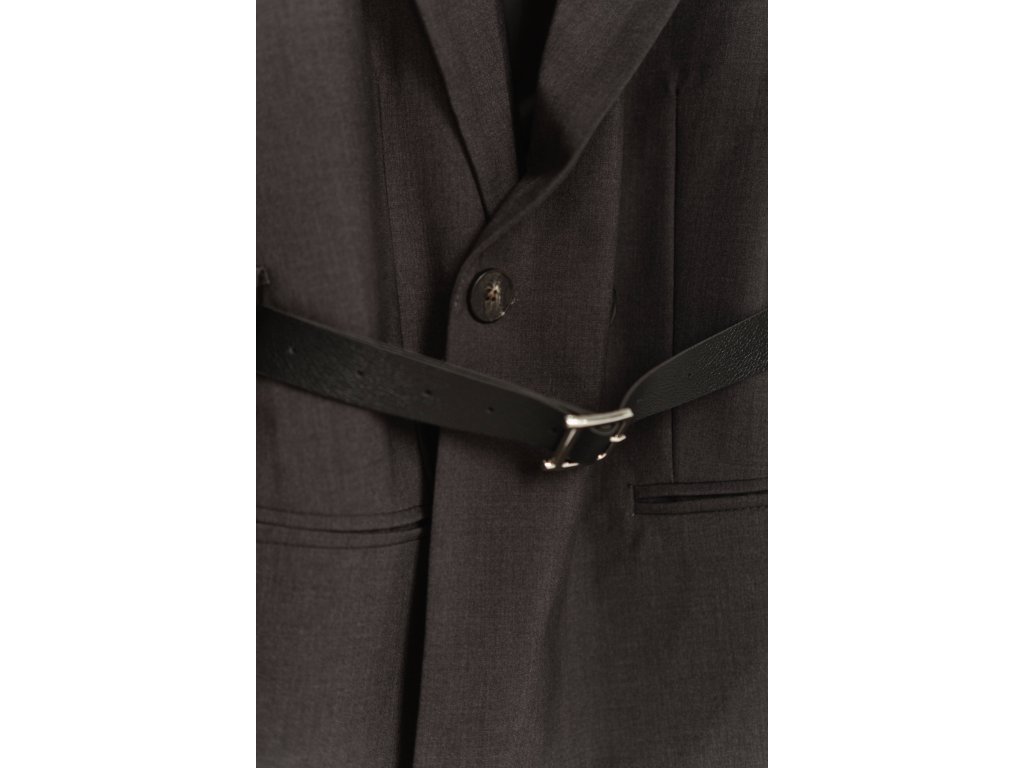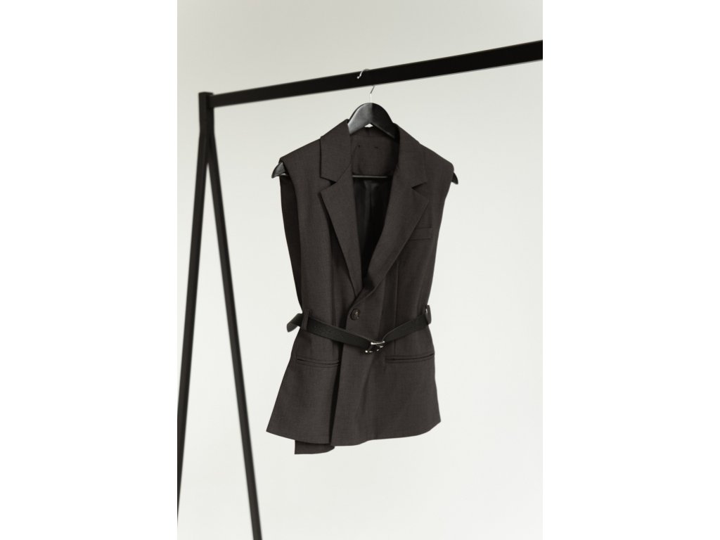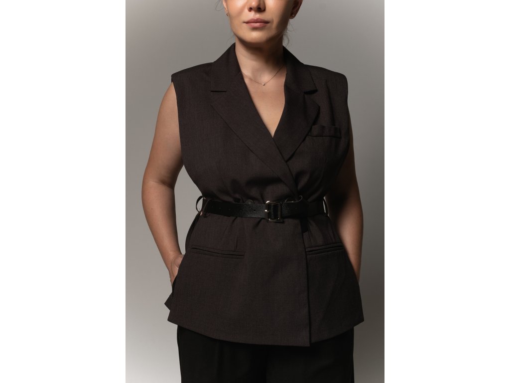 Vesta má klasické sako klopy, vrecká s pätkami a je doplnená o opasok, ktorý umožňuje prispôsobiť siluetu podľa vašej postavy.