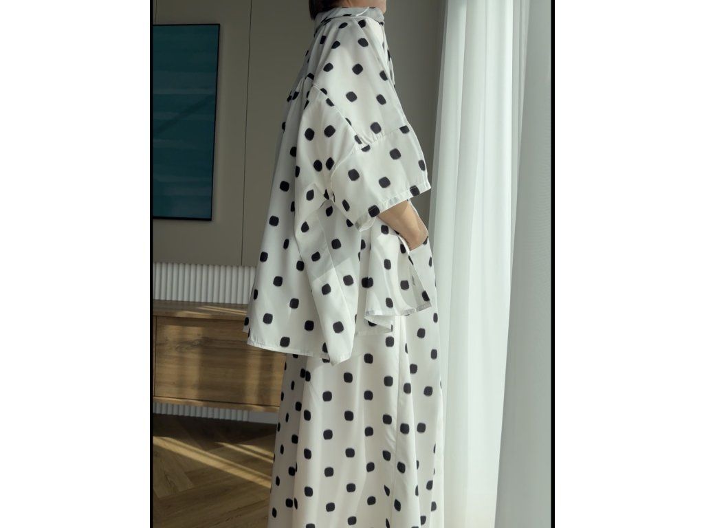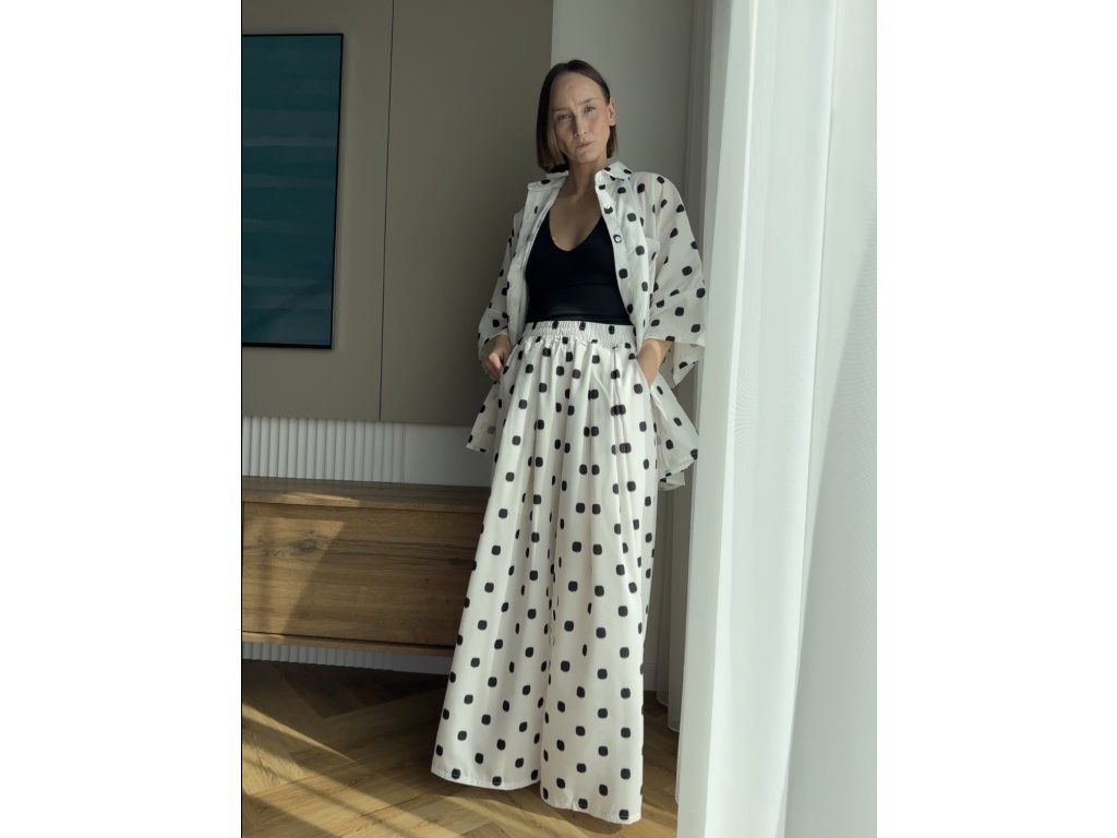 Nohavicove v širšom, rovnom strihu s elastický pásom na gumičku zabezpečuje pohodlie bez kompromisov a prirodzene sa prispôsobia postave. Jemný bodkovaný vzor dodáva hravosť, ktorá zostáva nadčasová.